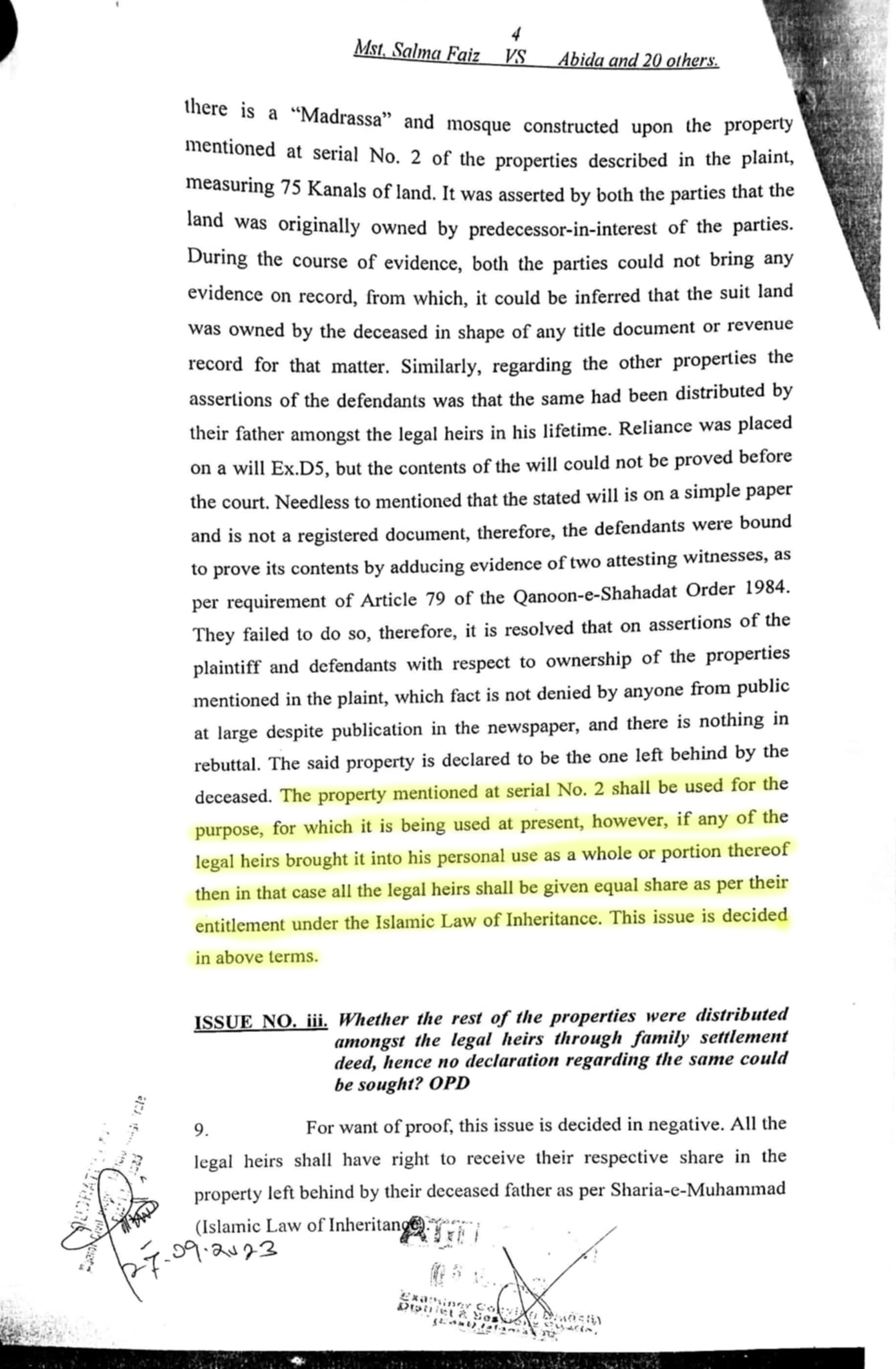 مولانا صاحب ؒکی وفات کے چند ماہ بعد مولاناؒ کی ایک بیٹی سلمیٰ فیض نےاپنی والدہ اور بہنوں کی طرف سے ایک عدالتی کیس دائر کیا، جس میں یہ دعویٰ کیا گیا کہ مولانا صاحب ؒ کی دیگر وراثتی زمینوں کے ساتھ ادارے کی 74 کنال زمین کو ورثاء میں تقسیم کیا جائے۔ اس عدالتی کیس میں مدعیہ ایک بہن سلمیٰ فیض تھی اور باقی تمام ورثاء مدعیٰ علیہ تھے۔ (دعوے کی کاپی درج ذیل ہے)