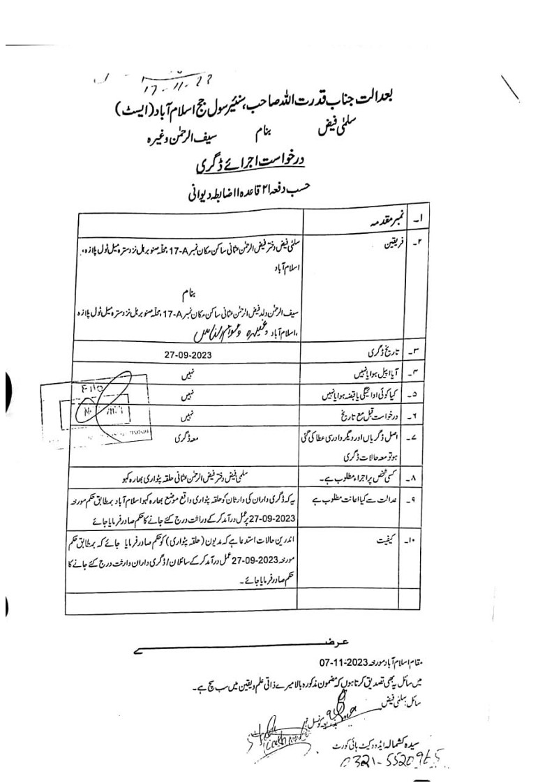 2) اجرائے ڈگری کی درخواست: اس عدالتی فیصلے کےچند ماہ بعدسلمیٰ فیض نے عدالت میں اجرائے ڈگری کی درخواست دی اوریہ استدعاء کی کہ’’ڈگری داران کی وارثان کو حلقہ پٹواری واقع موضع بارہ کہو، اسلام آباد بمطابق حکم مورخہ 27-09-2023پر عمل درآمد کر کے وراثت درج کئے جانے کا حکم صادر فرمایا جائے۔‘‘ (عدالت میں جمع کی گئی درخواست کامتعلقہ حصہ نیچے لف ہے)