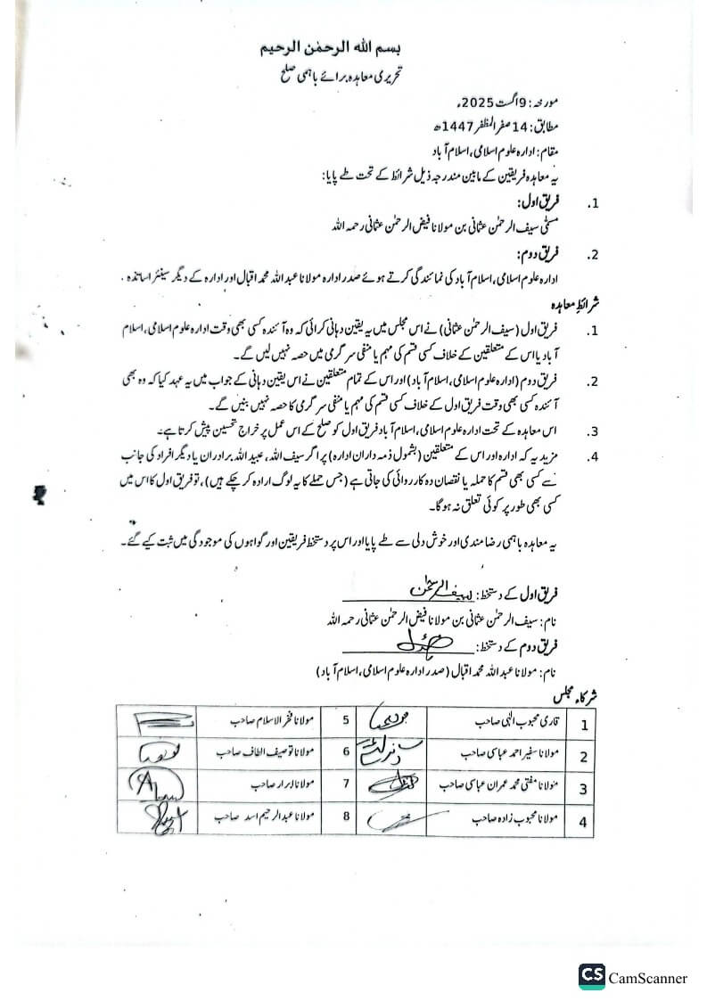 حالیہ قضیے کو حل کرنے کے لیےجولائی 2025ءایک جرگہ تشکیل دیا گیا۔جس میں سیف اللہ عثمانی وغیرہ نے علاقے کے ایک مقامی شخص،راجہ مہران کو اپنی طرف سے حکم بنایا اور ادارہ علوم اسلامی نے اپنی طرف سے محمد تزارت عباسی المعروف مولانا صفی اللہ صاحب(مہتمم مدرسہ عربیہ ریاض الجنۃ،بارہ کہو،اسلام آباد)کو ایک ماہ کی مدت کے لیےاپنا حکم مقرر کیا۔